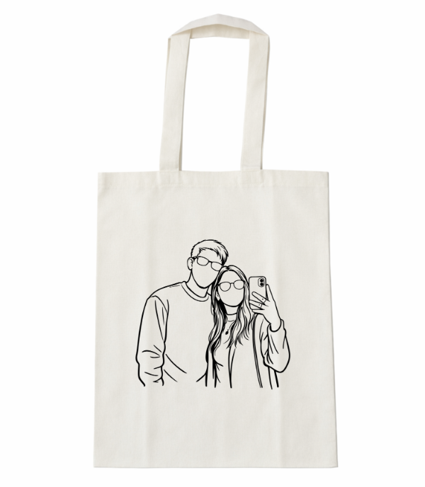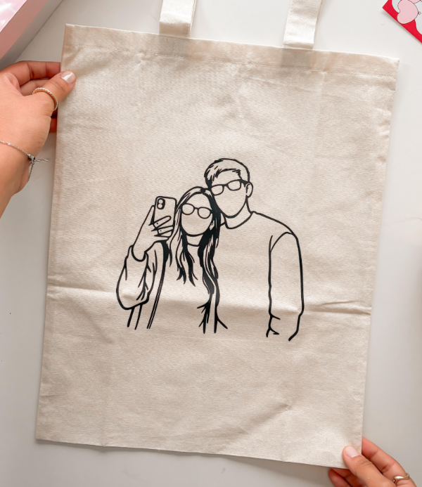 Bolsa tipo tote bag confeccionada en lienzo premium, personalizada con una ilustración estilo línea realizada a partir de una foto enviada por el cliente. Un producto práctico, original y con un toque artístico, ideal para regalar o usar todos los días.