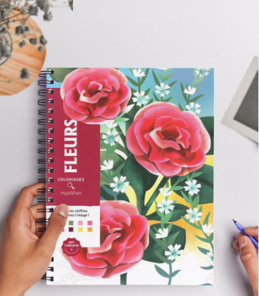 La encuadernación cuenta con tapa semi dura y anillado de alambre, lo que permite abrir el libro completamente y facilitar la experiencia de pintado en cada hoja.